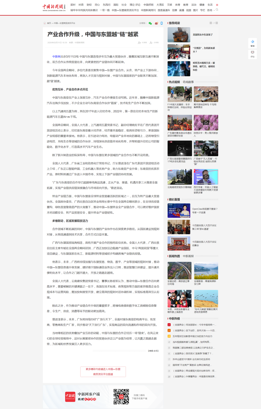 中新網北京3月11日電 中國與東盟連續多年互為最大貿易伙伴,隨著區域互聯互通不斷深化,雙方合作從傳統貿易往來,向更緊密的產業鏈協同不斷延伸。