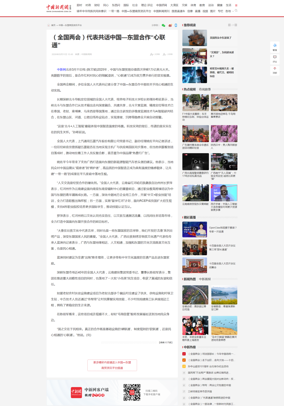 中新網北京3月11日電 2025年,中國與東盟貿易總值首次突破1萬億美元大關。亮眼數字的背后,是合作紅利對民心的細膩浸潤,“心聯通”已成為雙方攜手前行的堅實根基。全國兩會期間,多位全國人大代表向記者分享了中國—東盟合作中那些關乎民心相通的生動實踐。