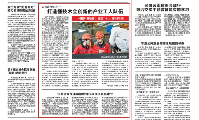 8月22日,《云南日報》二版專題報道集團打造懂技術會創新的產業工人隊伍。