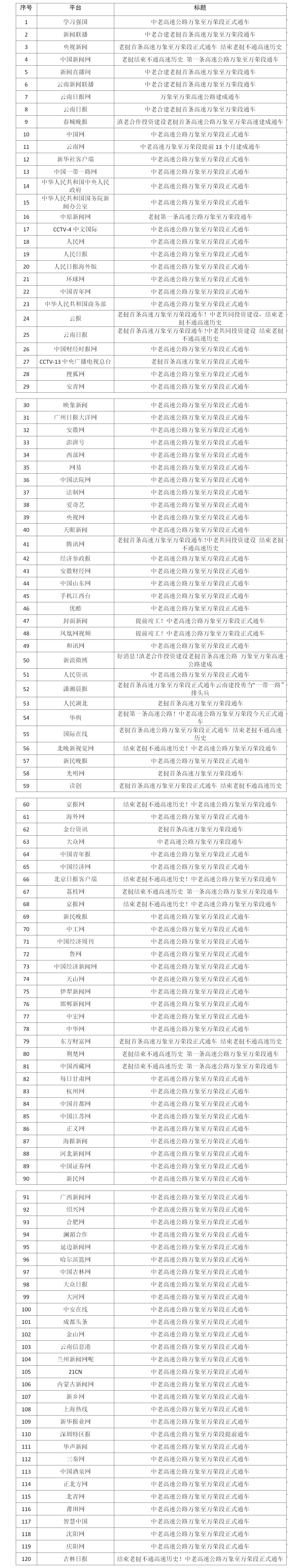 萬(wàn)萬(wàn)高速的通車吸引了來(lái)自新華社、人民日?qǐng)?bào)、中央電視臺(tái)、云南日?qǐng)?bào)、云南廣播電視臺(tái)等中央和省級(jí)主流媒體到現(xiàn)場(chǎng)采訪報(bào)道,中華人民共和國(guó)中央人民政府網(wǎng)、國(guó)務(wù)院新聞辦公室網(wǎng)站、學(xué)習(xí)強(qiáng)國(guó)、中國(guó)網(wǎng)、中國(guó)駐老撾大使館網(wǎng)站、人民日?qǐng)?bào)海外版、今日頭條等上百家媒體和平臺(tái)關(guān)注并轉(zhuǎn)發(fā)萬(wàn)萬(wàn)高速通車報(bào)道,在社會(huì)各界引起了強(qiáng)烈反響。