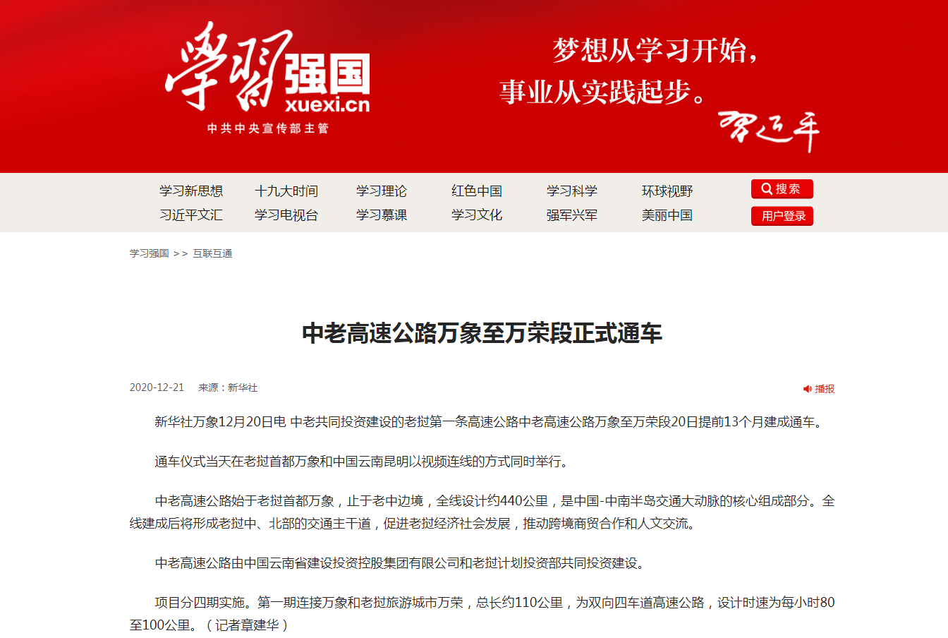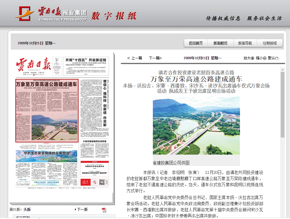 12月20日,云南建投集團(tuán)和老撾政府共同投資建設(shè)的老撾首都萬(wàn)象至中老邊境磨憨磨丁口岸高速公路萬(wàn)象至萬(wàn)榮段提前13個(gè)月建成通車,結(jié)束了老撾不通高速的歷史。