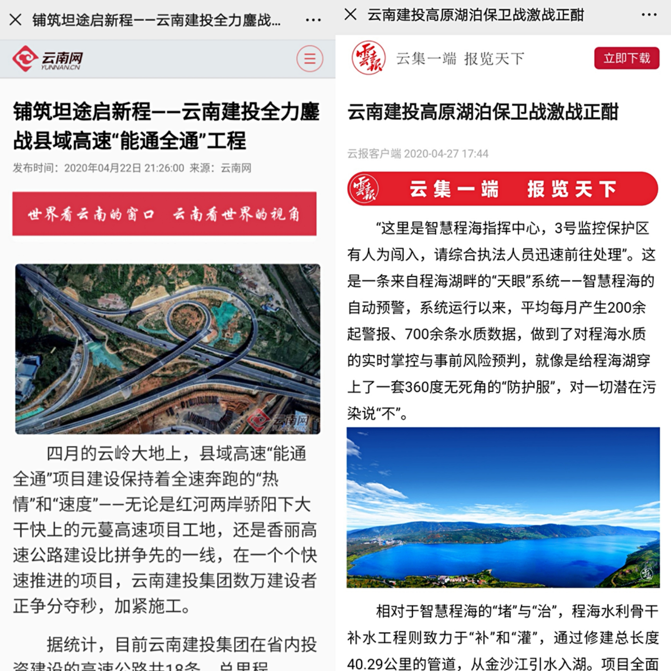 云南網、云報客戶端報道集團“能通全通”和高原湖泊治理項目