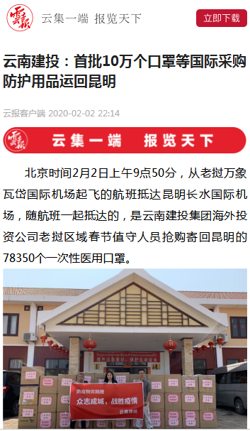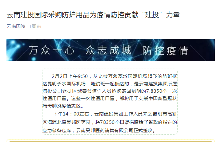 連日來,武漢新型冠狀病毒肺炎疫情牽動著全國人民的心。云南建投集團立即行動,發揮駐外機構優勢,整合優勢資源,通過多種渠道,從越南、緬甸、印度、老撾等國家購買防護用品,一場國際采購、國際馳援的抗“疫”戰,在云南建投集團上下持續打響。2月2日下午14:00左右,云南建投集團相關人員來到昆明市高新區海源北路昊邦醫藥園,將78350個口罩捐贈給了省政府指定的應急儲備倉庫,云南昊邦醫藥銷售有限公司正式簽收。