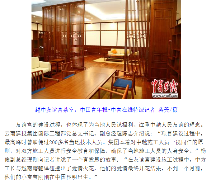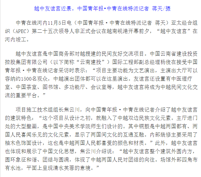 11月5日,《中國(guó)青年報(bào)》以《“越中友誼宮”在河內(nèi)竣工 將成中越民間交往平臺(tái)》標(biāo)題,報(bào)道由集團(tuán)承建的中國(guó)援建越南越中友誼宮項(xiàng)目在河內(nèi)全面竣工。報(bào)道內(nèi)容以項(xiàng)目主要功能、建筑特色,以及建設(shè)過程中的故事,并穿插了越中友誼宮內(nèi)部照片。充分展現(xiàn)了集團(tuán)施工建設(shè)水平和建投人的風(fēng)采。