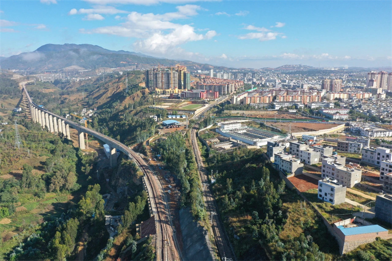 一聲長笛,穿越歷史時空的隧道,從廣大鐵路祥云西站延伸而出,經隧道、山谷、湖泊,一路挺進祥云經濟技術開發區。綠色硅光伏、新能源電池、鐵礦石加工、糧食貿易等產業在這里安家落戶,一萬余名產業工人在不停忙碌著。硅石、鋰電池等一系列產成品將通過鐵路專用線,經廣大鐵路后,北上到達長三角、成渝經濟圈,一條綠色可持續的發展之路蔚然呈現。2022年12月29日,由集團云南省鐵路集團有限公司參與投資建設的祥云財富鐵路專用線開通投入運營。