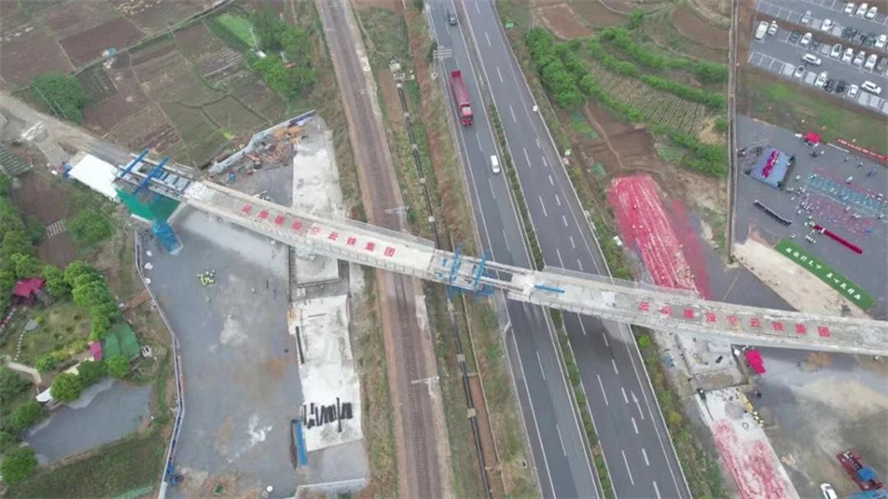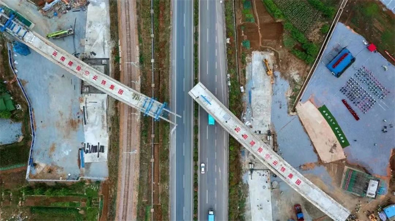 2022年4月18日,在茨坪村現場,歷時一小時,茨坪村特大橋21號墩經過逆時針轉角70.38度后,與20號墩成功“牽手”,標志著國內首座跨鐵路公路雙轉體曲線鐵路橋梁茨坪村特大橋轉體成功。