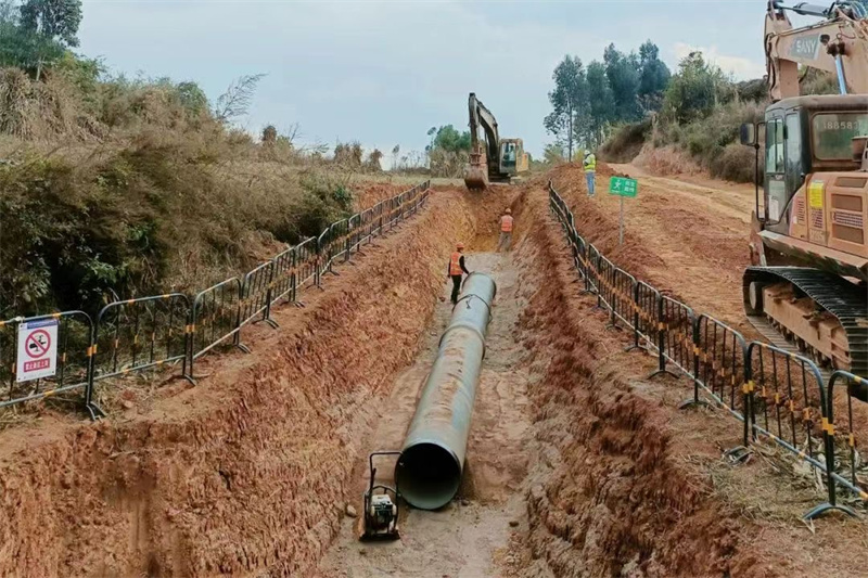 當(dāng)時正值雨季,加之征地拆遷工作推進(jìn)困難,嚴(yán)重制約施工進(jìn)度。項(xiàng)目經(jīng)理部不等不靠,立即啟動第一條管道——另仂水庫延伸段至芒款支管的施工。
