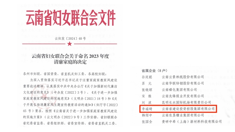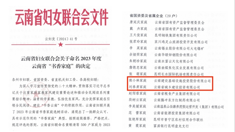 近日,云南省婦女聯(lián)合會(huì)下發(fā)了2023年度云南省“清廉家庭”“書香家庭”表彰通報(bào),集團(tuán)3戶職工家庭分別獲評(píng)云南省“清廉家庭”“書香家庭”。其中,云南省城鄉(xiāng)建設(shè)投資有限公司劉春肅家庭、云南建設(shè)基礎(chǔ)設(shè)施投資股份有限公司熊小林家庭獲評(píng)云南省“書香家庭”;云南省建設(shè)投資控股集團(tuán)有限公司國際工程部李瑞琦家庭獲評(píng)云南省“清廉家庭”。