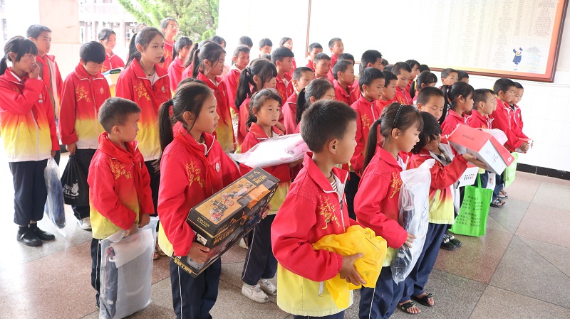 活動中,黨員、團青將捐贈的愛心物品分發(fā)給62名學生,領到心愿禮物的孩子們開心不已。