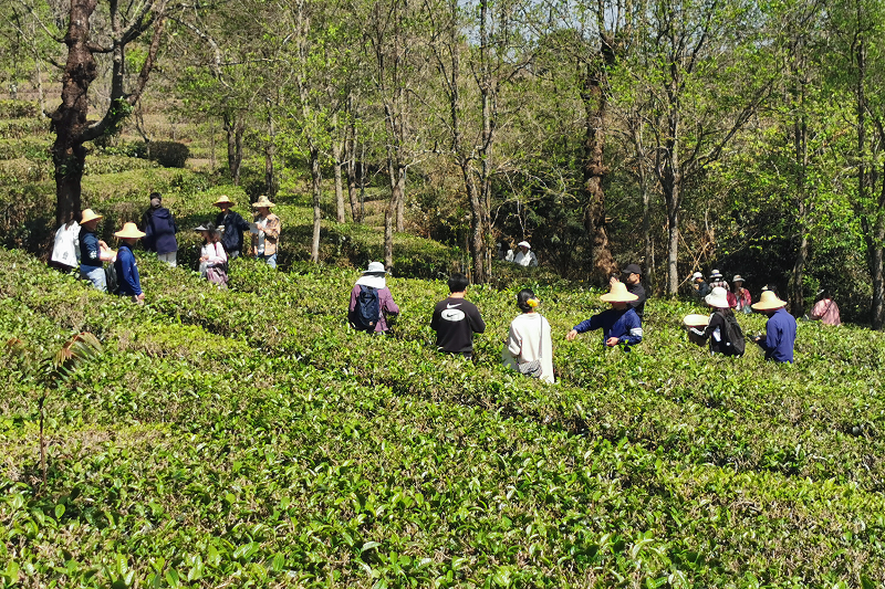 “采茶要采‘兩葉一尖’,葉子嫩的話,‘三葉一尖’也可。采摘的時候,用拇指和食指輕輕地挾住葉間幼梗的中部,往上一提便摘好了。”在采茶師的講解中,青年們穿行在茶樹綠林間,一邊欣然“拔尖兒”,一邊分享采茶心得。伴隨著歡聲笑語,一片片青綠從指尖收攏到掌中,成把的茶葉灌入背后的小背簍中。