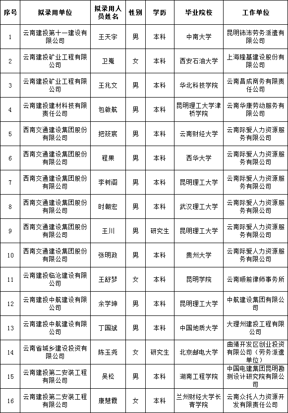 根據(jù)《云南省建設(shè)投資控股集團有限公司2023年社會招聘工作實施方案》有關(guān)規(guī)定,經(jīng)過報名、資格審查、人才測評、背景調(diào)查等程序,擬錄用王天宇等17人到云南建投集團所屬各單位工作,現(xiàn)予以公示。