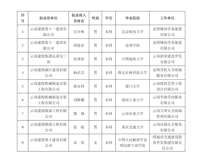 根據(jù)《云南省建設(shè)投資控股集團有限公司2023年社會招聘工作實施方案》有關(guān)規(guī)定,經(jīng)過報名、資格審查、人才測評、背景調(diào)查等程序,擬錄用吳少林等9人到云南建投集團所屬各單位工作,現(xiàn)予以公示。