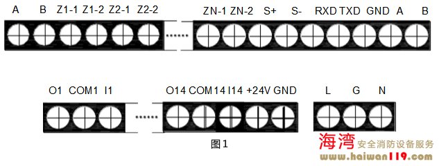 A、B:連接火災(zāi)顯示盤(pán)的通訊總線(xiàn)端子;