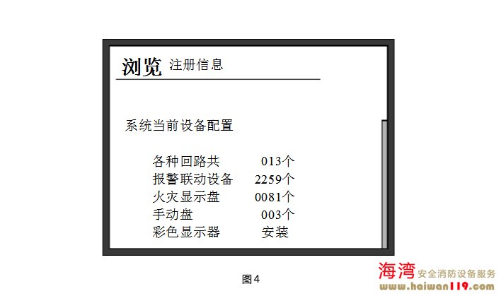 完成以上操作后,系統上電進行初始化(畫面顯示如圖1所示)。初始化完成后進入對運行記錄、隔離信息、聯動公式、聲光電源的自動檢查狀態(畫面顯示如圖2所示),自檢完畢,控制器對外接火災顯示盤、探測器和模塊進行注冊(如圖3所示),并顯示注冊信息 (如圖4所示) 。至此,開機過程結束,系統進入正常監控狀態。主機鍵盤上設有“自檢”鍵,按下此鍵后系統將進行和開機時相同的聲光及電源檢查。 關機過程按照與開機時相反的順序關掉各開關即可。要注意各個備電開關一定要關掉,否則,將有損壞電池的可能。